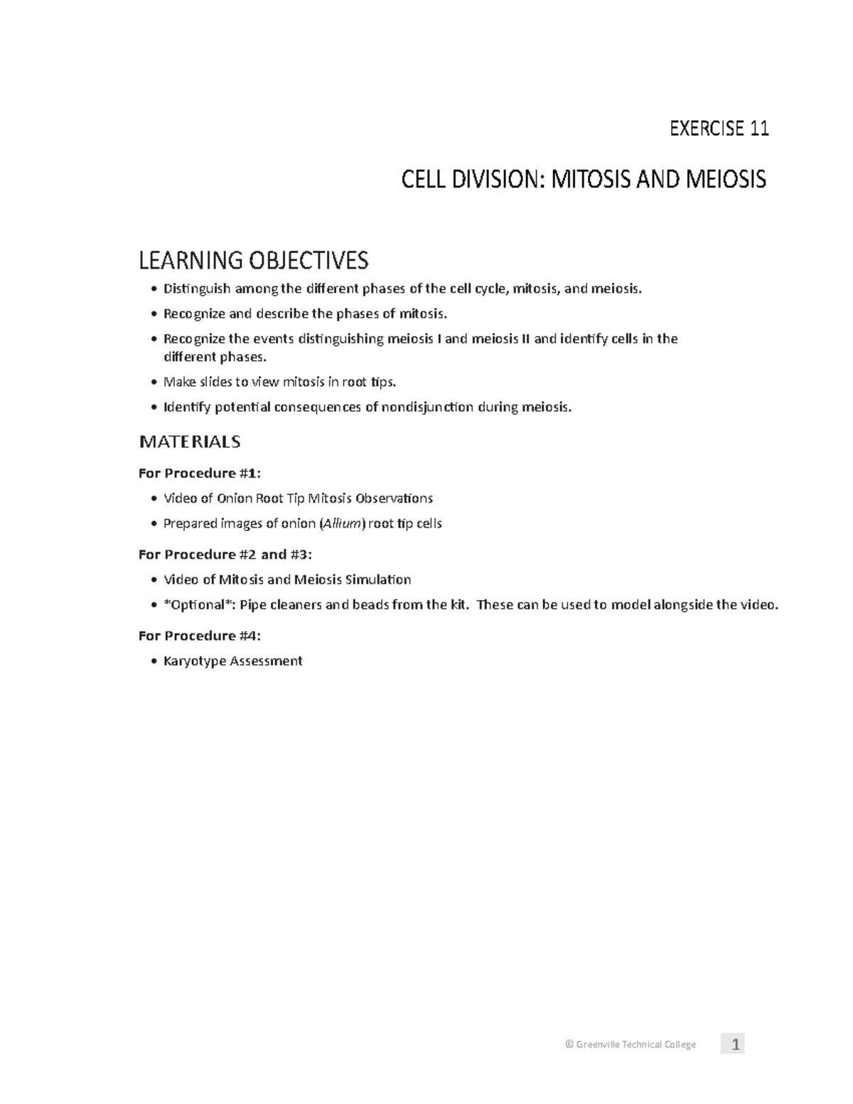 Experiment 11 Meiosis C Greenville Technical College 1 Exercise 11 Cell Division Mitosis And Studocu