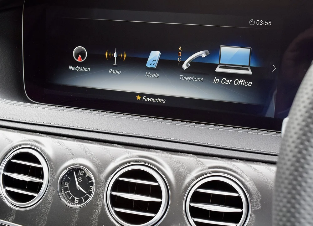 Inside The Car Inside A Closeup Of A Multimedia System With The Display On On The Central Control Panel With Wood And Chrome Elements On The Console Of An Expensive Mercedes Saloon