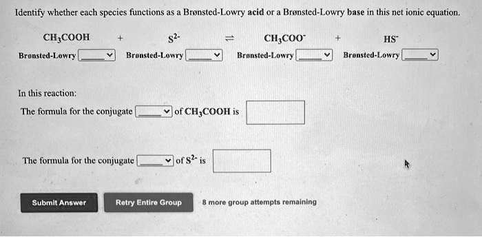 Solved Identify Whether Each Species Functions As Bronsted Lowry Acid Or A Bronsted Lowry Base In This Net Ionic Equation Ch Cooh Bronsted Lowry Ch Coo Bronsted Lowry Hs Bronsted Lowry Bronsted Lowry In This Reaction The Forula For The