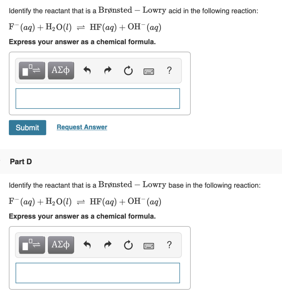 Solved Identify Whether Each Species Functions As A Bronsted Lowry Acid Or A Bronsted Lowry Base In This Net Ionic Equation Hf Aq Hco3 F H2c Course Hero