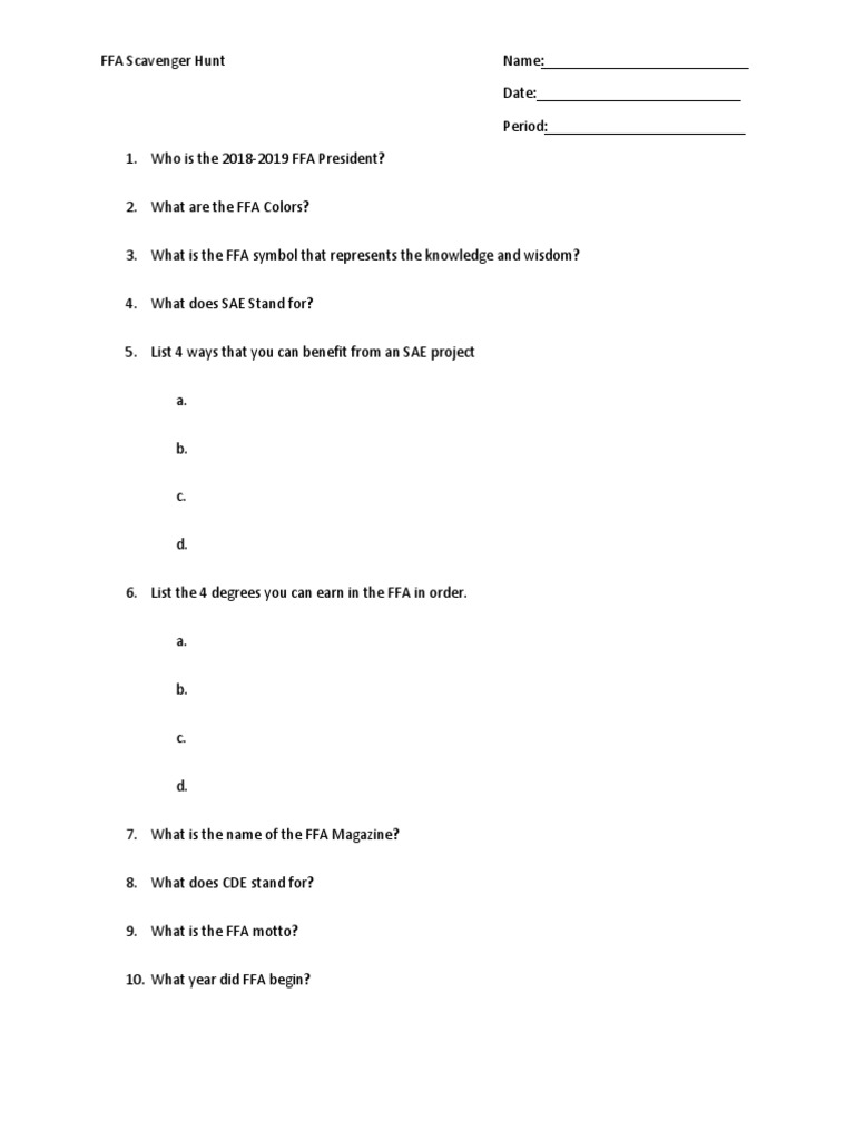 Ffa Scavenger Hunt Student Worksheet Pdf